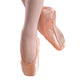 Hand shaped right angle platform, graduated insole. Deep vamp, low sides and elastic drawstring to flatter the line en pointe.